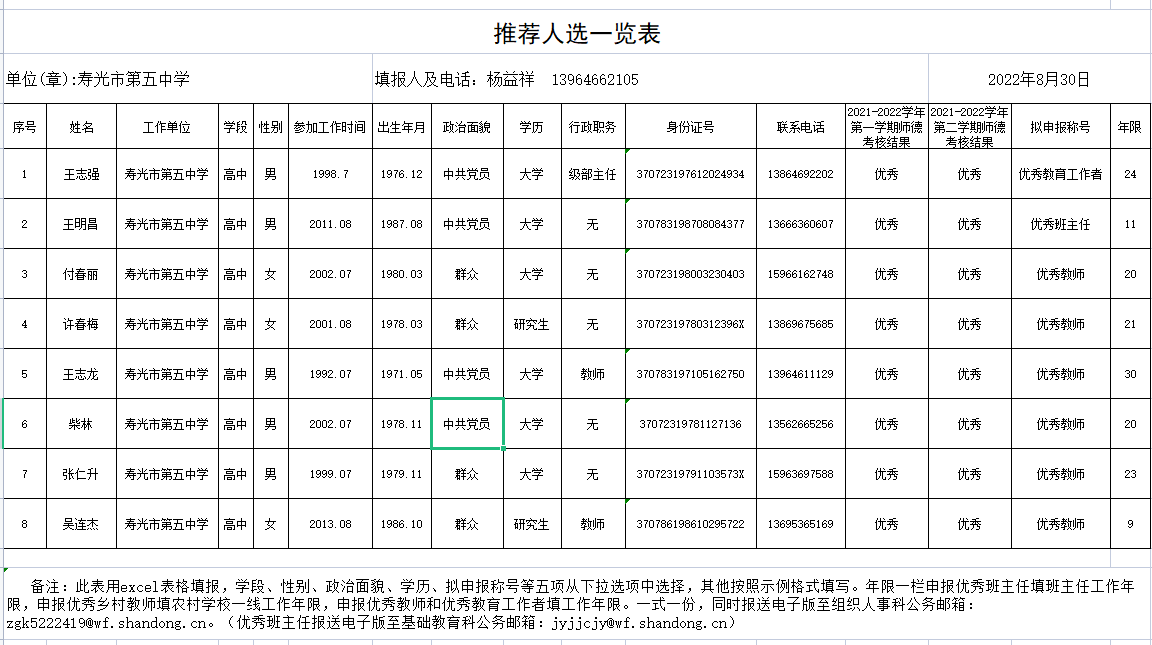 寿光五中2022年度寿光市优秀教育工作者、优秀班主任、优秀教师推荐人选一览表