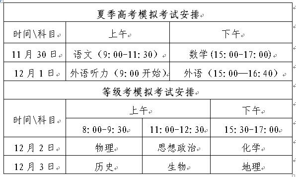 模拟考试时间为2019年11月30日—12月3日,其中英语听力考试连续进行两次,每次约20分钟。具体考试时间安排如下: