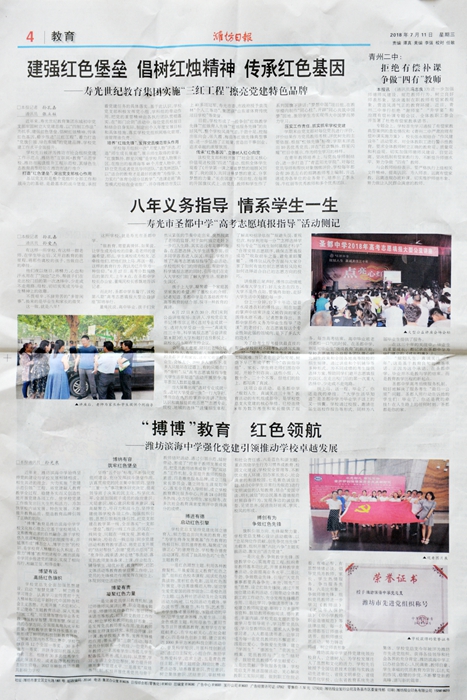 7月11日,潍坊日报4版以《八年义务指导,情系学生一生》为题,报道了我校在学生毕业后又开启教育新里程,通过举办高考志愿填报大型公益讲座和咨询指导,帮孩子们做好走出校门后的第一次选择的事迹。