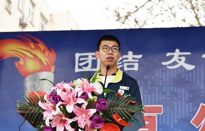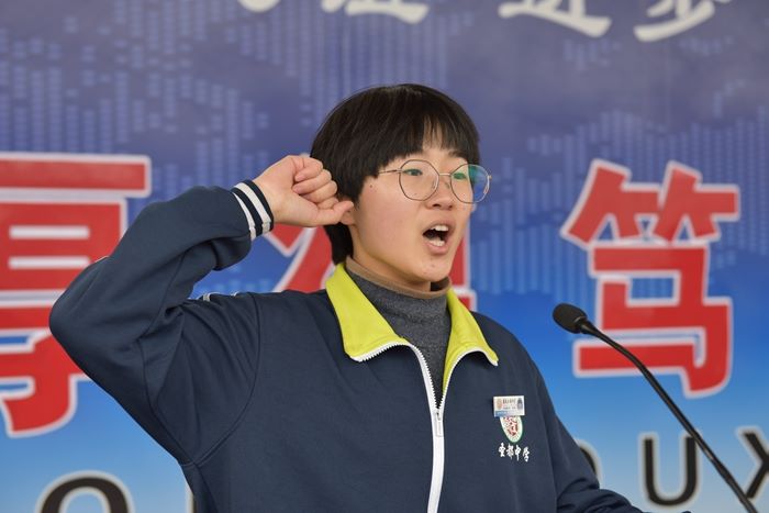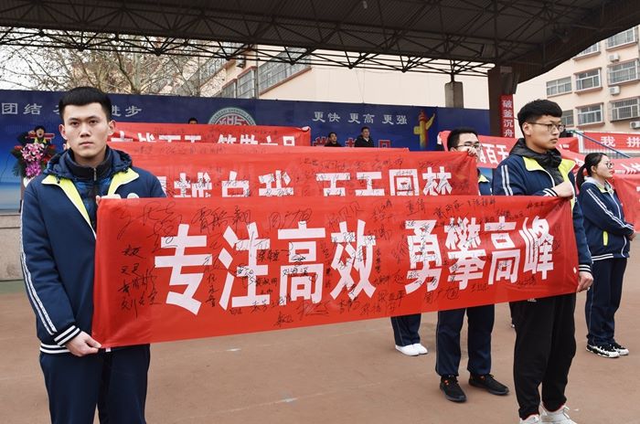 此时,春风习习,迎风展开的签名横幅携带着青春的力量,组成神圣而壮观的画面,全体起立,在李广祯同学的带领下发出了顽强拼搏为国成才的响亮誓言。