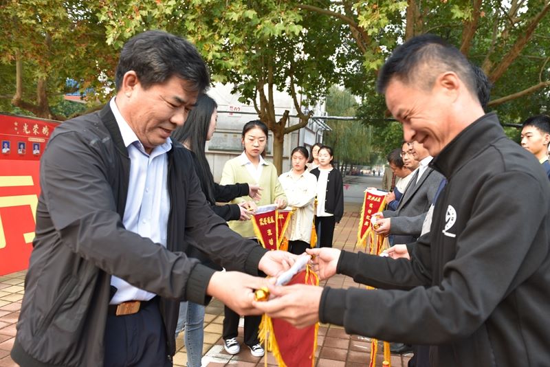 李耀华校长为郎旭军、杨益祥两位级部主任颁发了“优秀级部”流动红旗,为慈建宇、陈杰、李新永、王志伟等24位班主任颁发了“优秀班级”流动红旗。