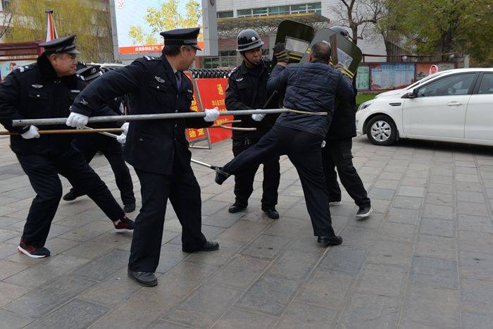 30日上午9:40分,刘云祥宣布演练正式开始,一“歹徒”手持凶器强行闯入校园,安保队员高声通知校园内活动的师生迅速撤离,巡逻队员用盾牌、警棍、防爆钢叉阻截“暴徒”,同时启动校园一键式报警系统,警讯直达金盾互联网报警平台及110报警中心,最终歹徒被制服,城区派出所巡逻民警将其带走,演练结束。