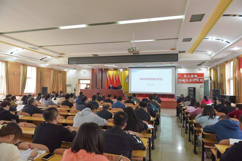 为进一步明确教学目标,提升育人质量,10月13日下午,我校教学一部、二部在学术报告厅东厅召开了潍坊联考质量分析会,校长助理 郎旭军作工作部署和强调,级部主任陈石蕾、朱晓鹏针对本部联考情况分别做分析和总结,一部、二部全体教师参会。