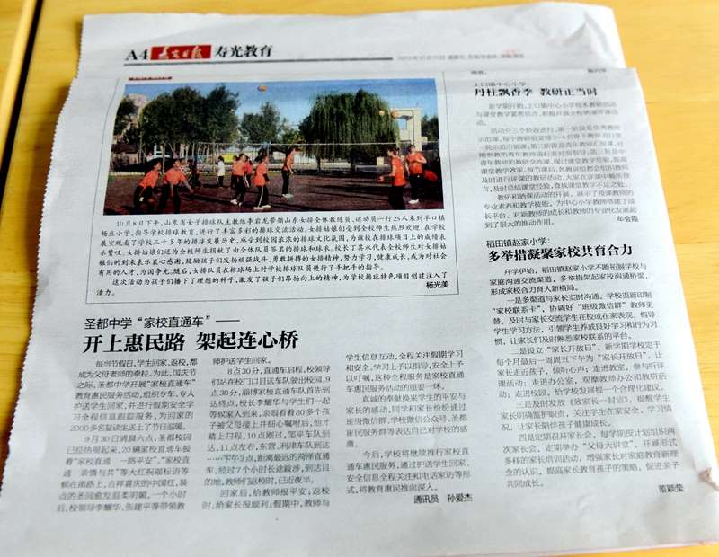 10月11日,寿光日报在A4版以《圣都中学“家校直通车”—开上惠民路,架起连心桥》为题,报道了我校在国庆节放假之际,组织专车、专人护送学生回家,并进行假期安全、学习全程跟踪服务的事迹。10月8日,寿光市教体局网站将该文头条置顶,引起社会广泛关注和好评。