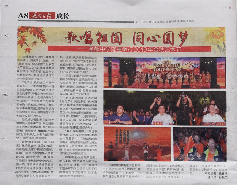 10月9日,寿光日报以《歌唱祖国,同心圆梦——圣都中学隆重举行2019年金秋艺术节》为题在A8版头条报道了我校金秋艺术节暨国庆文艺汇演盛况,重点对本次艺术节丰富的节目内容和艺术特色向读者做了推介。
