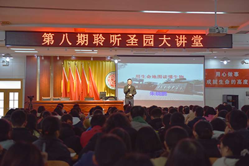 12月16日下午2:00,圣都中学第八期“聆听圣园”大讲堂活动在学术报告厅东厅举行,师训处主任慈建宇主持,圣都中学中共党员、教学二部级部副主任朱晓鹏主讲,六百多名学生参与聆听。