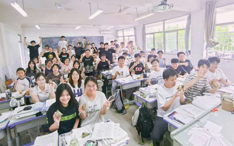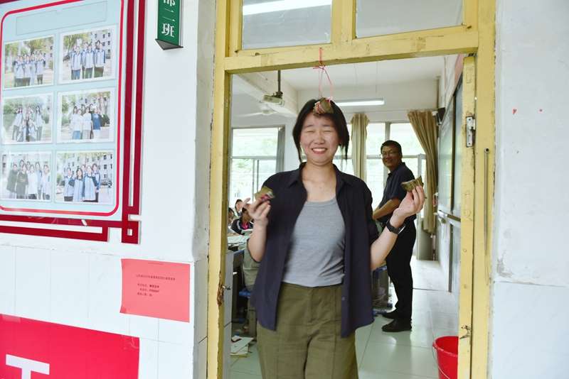 有的班级特别设置了“跃起触粽”环节,用红丝线将粽子高高悬于门框之上,学生们欢快地跃起触碰,既增添了节日趣味,又寄托了“一举高中”的美好寓意。