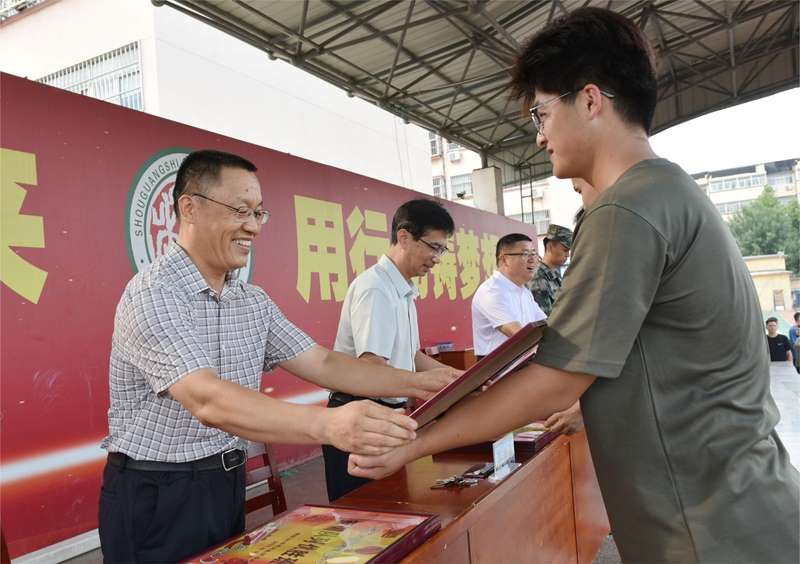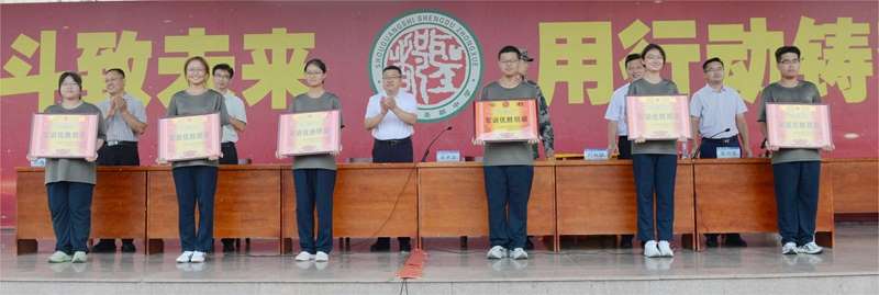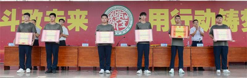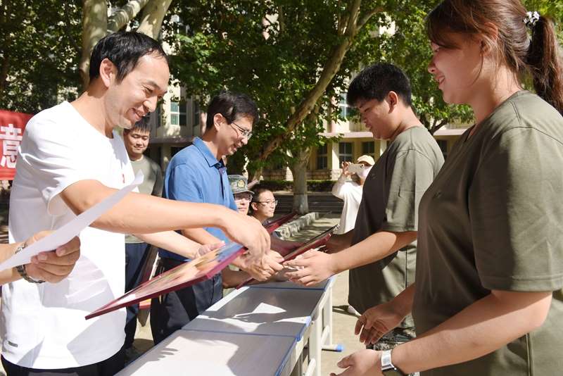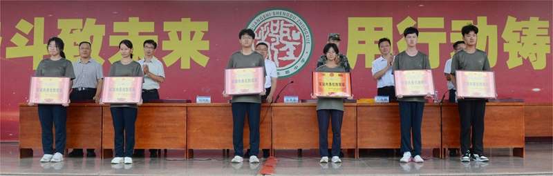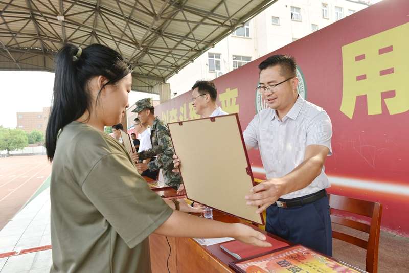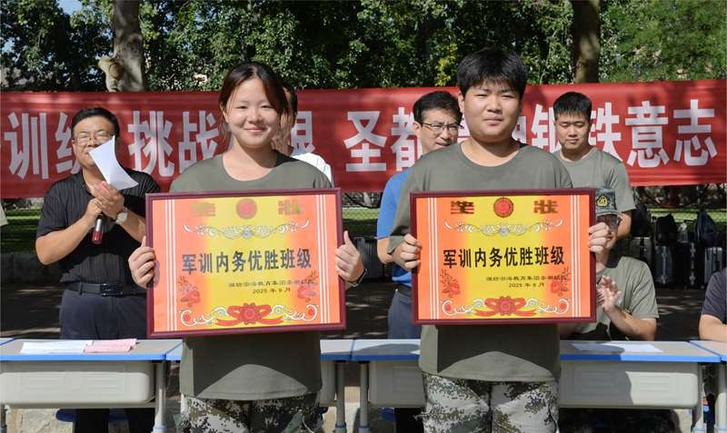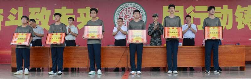 教官徐中华、张伟公布本次军训优胜班级评选结果,随后与会领导为获奖班级逐一颁发奖状。