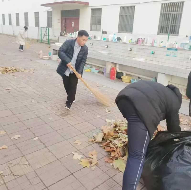 清晨的温度已近零下,班主任老师怕孩子们冷,也担心落叶太多耽误孩子们吃饭、上课,便主动拿起了扫帚。