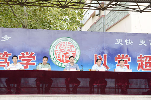 大会在雄壮的国歌声中拉开帷幕。党总支书记傅伟宗主持,黄本东校长作动员报告。上午7点40,分,傅伟宗书记宣布大会开始并向新生简要介绍了学校的历史、办学理念和历年来的辉煌成绩;黄本东校长对全体受训同学进行了军训动员。黄校长首先强调了高一高二军训的重要意义,接着对参训师生提出了期望,要求同学们把校园当军营,把操场当战场,训出素质,训出意志和力量;总教官和新生代表分别发言。