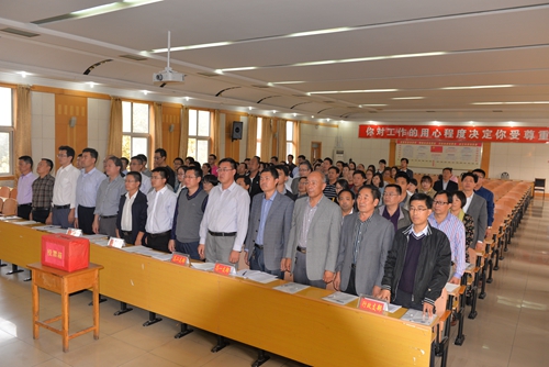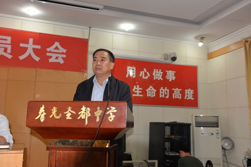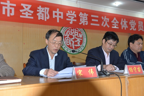 伴随着雄壮的国歌声,全体党员起立,第三次党员全体代表大会隆重开幕,在宋伟同志宣布了议程后,傅伟宗同志代表上届党总支做工作报告。报告总结了校党总支在党组织建设、群团众工作、社区工作、工会妇女等工作取得了卓有成效的成就,广大党员在党组织带领下,充分发挥先锋堡垒作用和模范带头作用,身先士卒、勇于拼搏,促进了教学质量的大幅度攀升;基于感动教育的“人生规划教育”、“真诚关注三十年工程”全面启动并取得了社会各界广泛赞誉的成就;教师争相参与教育科研课题研究,新的立项课题不断诞生,教育科研硕果累累。傅伟宗同志说,在上届全体党员大会闭会期间,在广大党员和全体教职员工的不懈努力下,圣都中学德育流程彰显出生命力强大的育人效应,得到了社会的广泛赞誉;特色办学突出、学本课堂引起全国关注;办学条件进一步改善,家校沟通力驱多元效果凸显;在今年的高考中,学校更是取得了骄人的成绩,在潍坊市政府成果奖评选中,我校荣获寿光市唯一的集体一等奖,董绳民校长荣获寿光市唯一的突出贡献奖。圣都中学的教书育人环境更加风清气正,各项工作都受到了上级领导的肯定和社会的高度认可。