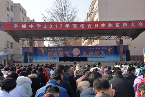 2月24日下午,圣都中学复读部全体师生齐聚体育场,隆重举行高考百日冲刺誓师大会,会议由复读一部主任杨益祥主持,副校长张建平做《沉着应对,挑战自我,以最佳状态迎接高考》动员报告,复读二部主任郎旭军就班级管理方面做了具体要求。