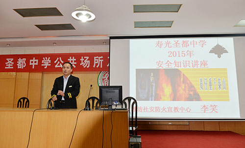 安全是成长的前提,教师不仅传道授业解惑,更担负着培养学生安全能力的重任。为适应安全教育新需求,2015年10月28日下午,圣都中学组织全体科任教师,在学术报告厅进行以火灾防范为重点的安全知识教育和应急能力培训。会议由教育处梦安宁主持,潍坊社安防火宣教中心李笑主任主讲。