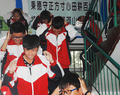 为提高师生地震自救和互救的能力,2014年10月17日下午,圣都中学组织高一级部全体师生进行了“地震逃生应急疏散”演练。