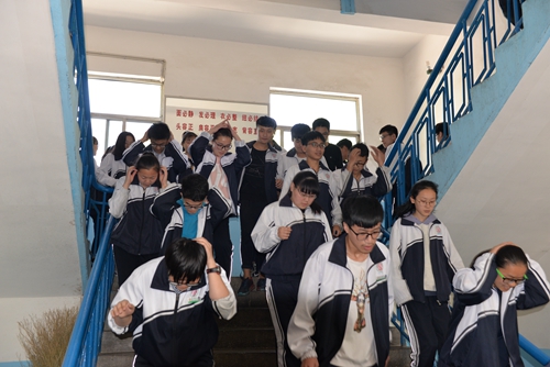 27日上午9:40分,警报声响,紧急疏散正式开始,班主任老师立即要求学生迅速在重心较低、结实牢固的桌子下面躲避,并紧紧抓牢桌腿,同时安排专人打开了教室前后门。从听到警报数到5秒后,一、二楼的班级依次疏散,15秒后,三四楼班级开始疏散。按照“谁近谁先,先低后高”的原则,各班从就近楼梯分两路纵队沿楼梯两侧依次疏散。疏散过程中,各班级师生密切协作,迅速、有序,历时1分30秒到达安全地点。