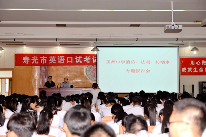 为进一步增强同学们的防火、防触电、防溺水和法制意识,7月12日下午,圣都中学“三防(防火、防触电、防溺水)”暨法制教育专题报告会在学术报告厅举行,教育处主任王新光主持,寿光市公安消防大队警官王旭东、寿城律师事务所律师王伯祥分别做防火、防触电、防溺水及法制专题报告,高二全体师生参加。