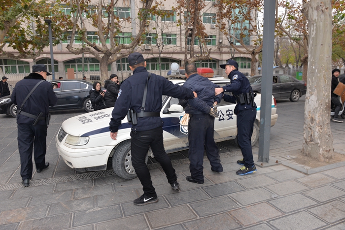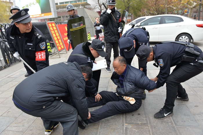 30日上午9:40分,刘云祥宣布演练正式开始,一“歹徒”手持凶器强行闯入校园,安保队员高声通知校园内活动的师生迅速撤离,巡逻队员用盾牌、警棍、防爆钢叉阻截“暴徒”,同时启动校园一键式报警系统,警讯直达金盾互联网报警平台及110报警中心,最终歹徒被制服,城区派出所巡逻民警将其带走,演练结束。