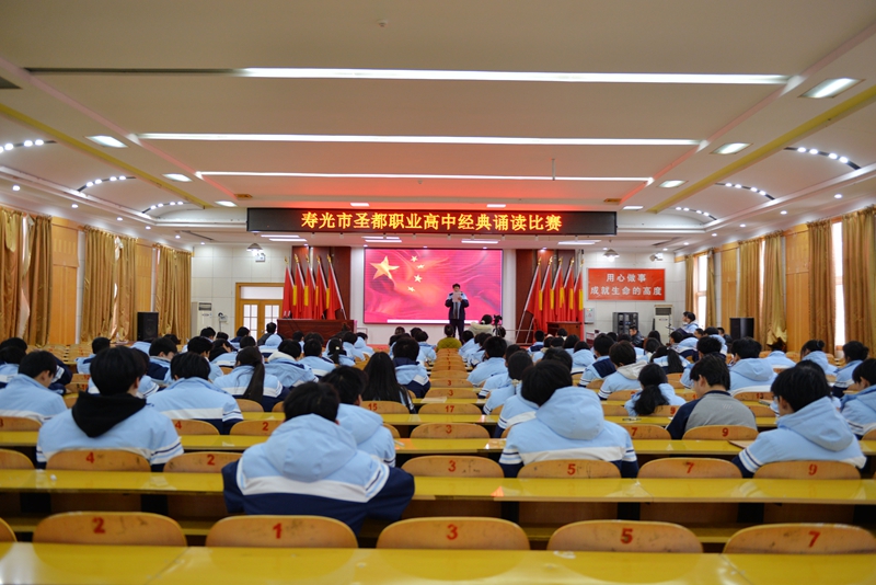为传承中华优秀语言文化,提升学生语言文字运用能力与人文素养,12月22日,潍坊渤海教育集团圣都职业高中高一年级在学术报告厅东厅举办了“青春诵经典,书香润校园”经典诵读比赛。活动由年级主任王文豹致辞并作总结,学生韩雍欣主持,高一年级18名选手参赛,王越、郭光晟等五位教师担任评委,副校长张海涛到场指导,高一年级全体师生现场观看。