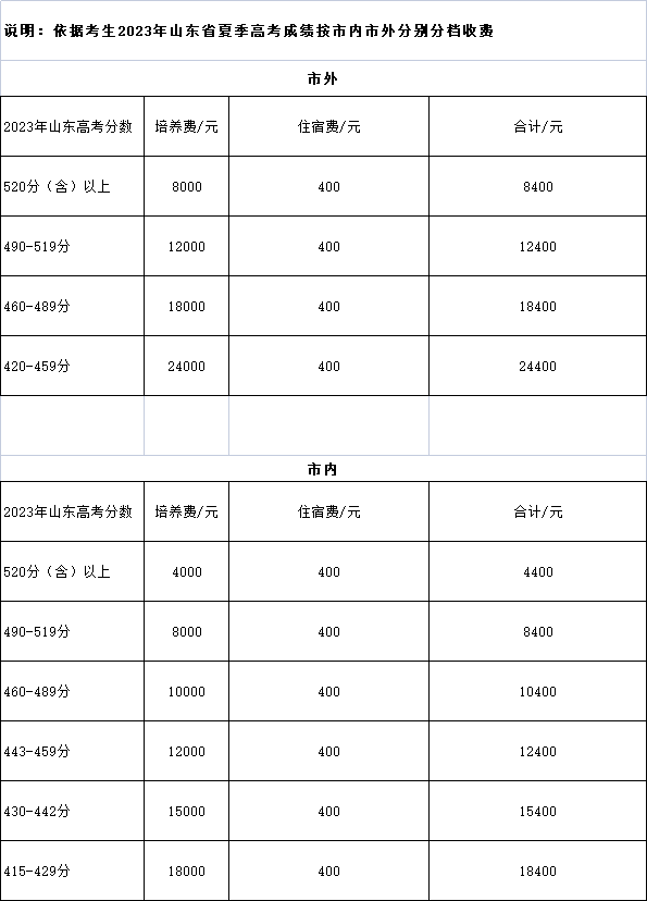 依据上级有关政策规定及考生2023年山东省夏季高考成绩分档收费。