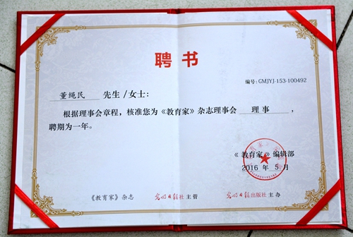 日,由光明日报社主管、光明日报出版社主办的《教育家》杂志发来聘书和牌匾,我校被推选为教育家杂志理事单位,根据理事会章程,理事会常务会议核准董绳民校长为《教育家》杂志理事会理事。