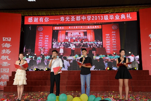 6月15日上午,圣都中学2013级毕业典礼在东餐厅隆重举行,灿烂的笑容,五彩的鲜花,嘹亮的歌声,以及经久不息的掌声,使整个东餐厅变成了欢乐、幸福的海洋。校长董绳民携学校领导班子出席典礼,1100多名高三学生和任课教师参加,200多名家长代表受邀观礼。蔺骁平、郑晨阳、王洁、郑琪山四名同学担纲主持,副校长张清泉发表讲话应邀客串主持人,与学生一起主持了部分环节。