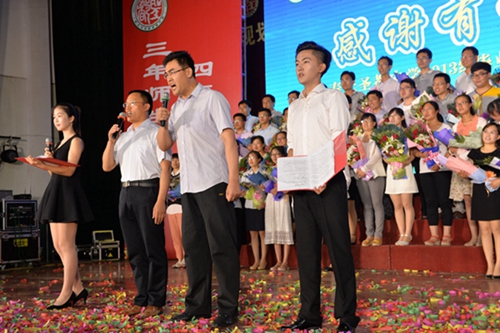 “六月,鲜花绽放的日子,六月,是我们展翅高飞的季节。”四位学生代表用诗朗诵《圣都三年,相逢如歌》,表达了2013级学子对老师们最真切的敬与爱。