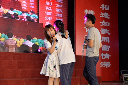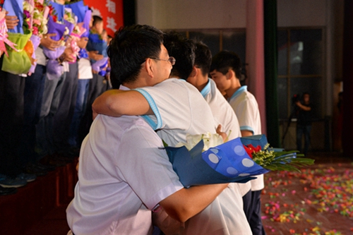 “千言万语难以表达我们的心情,惜别之际,请老师接受学生们送上的一束鲜花吧。”在同一首歌的旋律中,学生代表们把一束束散发着爱的芬芳的鲜花,递到了老师们的手中。深情拥抱,镁光闪烁,三年师生友谊在此定格。