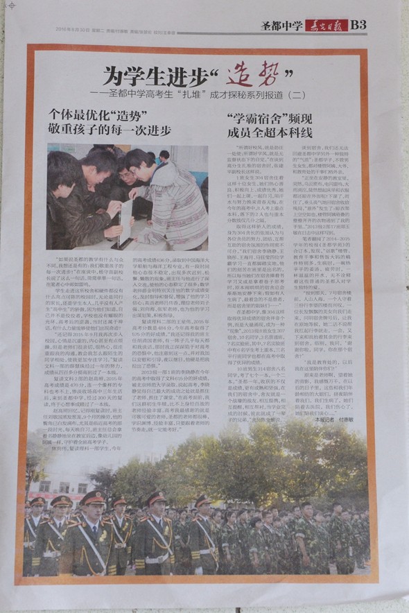 文章用大量详实的案例,从“个体最优化“造势”、“敬重孩子的每一次进步”、“学霸宿舍,频现成员全超本科线奇迹”、“凝聚集体意志,激活情感力量”等角度,展示了圣都学子在学校所预设、营造的“大趋势”中,不断克服障碍、激发潜能,一步步实现人生价值的故事。