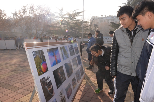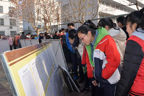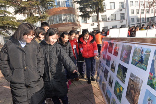 12月29日,圣都中学东办公楼广场,阳光轻洒,群鸽翩飞,“庆元旦迎新春”——2017圣都中学首届师生书画作品展隆重开展,广大师生兴致勃勃地参观了展览。