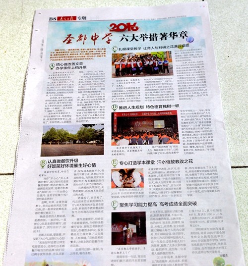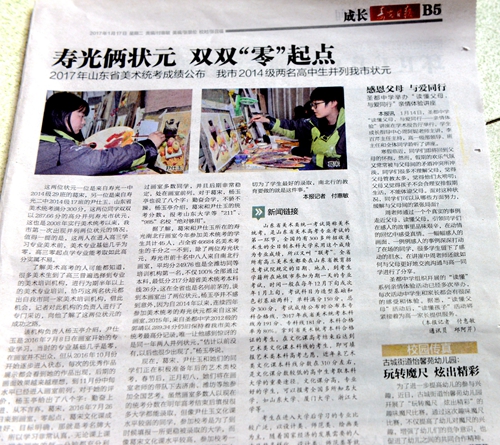 1月17日,寿光日报分别在B5/B8版以 “感恩父母,与爱同行”/“圣都中学六大举措著华章”为题,报道了我校亲情体验讲座和2016年度取得的可喜成绩,引起社会和家长们的广泛好评及关注。