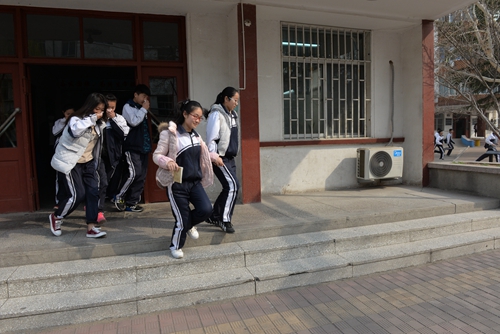 3月16日上午9:45警报声响,演练正式开始。班主任老师立即按照演练预案安排学生打开教室前、后门,俯身用湿手绢捂住口鼻,就近楼梯按照“谁近谁先,先低后高”的原则,分两路纵队(前四排学生按顺序一个跟一个走前门,后五排后学生按倒序一个跟一个走后门)沿楼梯两侧依次疏散。整个疏散过程,各班级师生密切协作,迅速、有序地安全到达集合地点,历时1分23秒,出色地完成了演练任务。