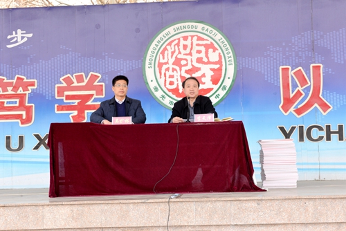 李天泽主任首先分析了一模考试中存在的基础知识不够扎实、审题能力差、会而不对、综合学科做不完等四个方面的问题,建议同学们“处理好审题与解题、会做与得分、快与准、难题与易题”四大关系,做好知识点、学习方法、考试技巧三大总结,以及明确丢分原因,学会考试。在谈到二轮复习时,李天泽提出了“强化基础、重视考练、勤于梳理、注重规范、挖掘潜能”等十条策略,鼓励同学们利用剩下的80天,制定计划,确立目标,严格要求,打赢高考这场硬仗。 吴扩林副校长做二轮冲刺动员,并对一轮检测中暴露出来的几个关键问题进行了重点强调:高度重视错题、难题,正确对待成绩的起伏,充分认识到考试是最好的复习,查缺补漏,是对最近阶段学习状态的最佳反馈。