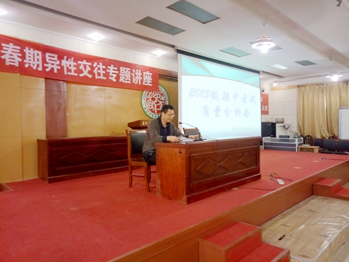 4月25日下午4:00,高二级部期中考试质量分析会在学术报告厅召开,级部主任王耀文主持会议,副校长杨守苗讲话,副校长冯永刚做成绩分析总结,高二全体教师参会。