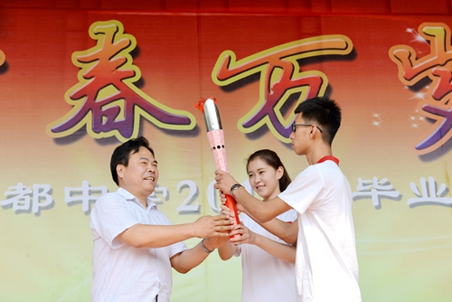 校长董绳民从“做健康的追梦人”、“做真正的读书人”、“做靠谱的性情中人”三个方面发表毕业致辞,深情嘱托同学们孝敬父母、勿忘母校,在继续学习中不断成长。致辞结束,在激昂的《生命礼赞》乐曲中,同学们迎来了颁发毕业证书的神圣时刻。当董绳民校长将大红的毕业证书郑重交到学生代表手上时,全场响起了经久不息的掌声。