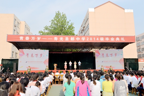 6月15日上午,由四名高三学生担任主持的圣都中学“青春万岁--2014级毕业典礼”在体育场隆重举行,中国教育科学研究院韩立福博士到会讲话,校长董绳民颁发毕业证书并致辞,师生代表分别发表毕业感言并献上了精彩的文艺节目。2014级全体同学的家长应邀观礼,现场见证了孩子们难忘的毕业仪式。