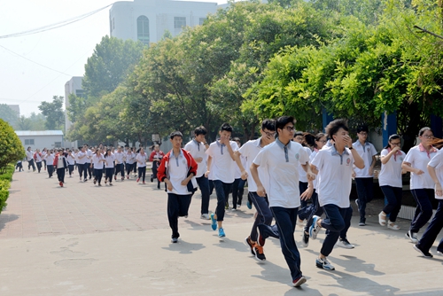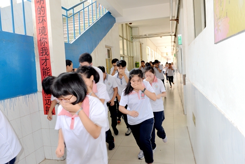 上午9:40警报声响,演练正式开始。班主任老师按照预案立即安排学生打开教室前、后门,双手抱头,弯腰跑出,就近楼梯按照“谁近谁先,先低后高”的原则,分两路纵队沿楼梯两侧依次疏散。整个疏散过程,各班师生密切协作,迅速、有序地安全到达集合地点,历时1分30秒,出色地完成了演练任务。