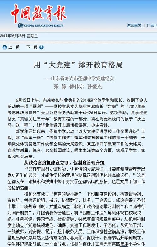 6月28日,中国教育报在11版以《用“大党建”撑开教育格局——寿光市圣都中学党建纪实》为题,报道了新学年开始以来,圣都中学“以大党建促进学校工作全面升级”,将“两学一做”“四制工作法”落实到教育教学工作的每一个细节,于细微处体现党建工作统领全局的大局意识的事迹。