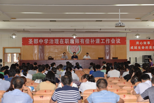 7月29日上午,圣都中学治理在职教师有偿补课工作会议在学术报告厅召开,副校长杨守苗主持,校长董绳民传达市教育局治理在职教师有偿补课调度会议精神,并对治理教师有偿补课工作做专项部署,全体教职工参会。