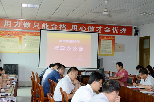 8月30日上午,我校2017--2018学年度第一次行政办公会在行政会议室举行,校长董绳民发表新学年学校管理工作意见,书记傅伟宗就队伍建设等问题提出要求,副校长杨守苗等领导对新学期工作进行部署。