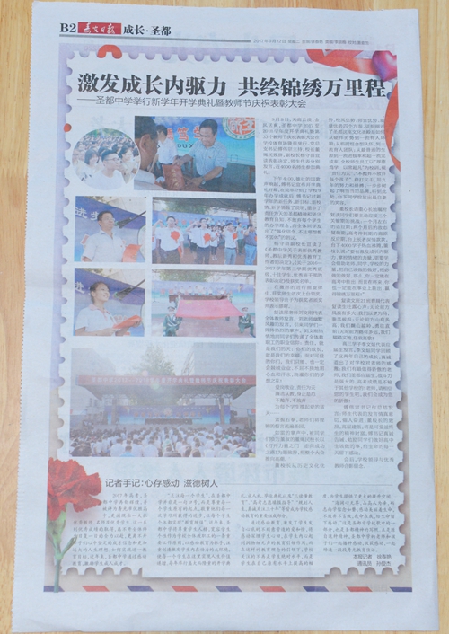 记者在编者按中说:“关注每一个学生”,在圣都中学并非是一句口号,而是尊重每一个学生原有的起点,敬重他们每一次学习所获得的进步,让每个学生个体都实现“教育增值”。近年来圣都中学将尊重学生人格,宽容学生个性作为学校全体教职工的一条重要工作原则,每年举行盛大而隆重的开学典礼、成人礼、毕业典礼及“三读懂教育”“高考志愿填报指导”、“规划人生、真诚关注三十年”等感动教育一系列活动,大大激发了学生发自心底的感动,在收获感动的同时,提升自己,正是这种不放弃不言败的圣都精神,缔造了寿光教育奇迹。