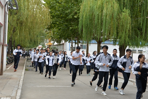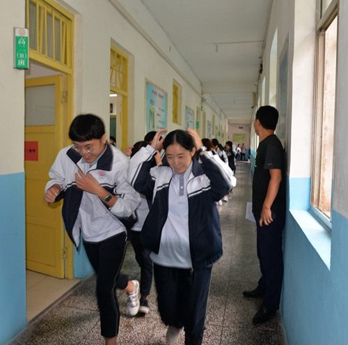 上午9:40分,警报声响,王新光主任宣布演练正式开始,班主任老师按照演练方案立即要求学生迅速在重心较低、结实牢固的桌子下躲避,并紧紧抓牢桌腿,同时已有专人打开了教室前后门。警报响起5秒后,一、二楼各班依次疏散完毕,15秒后,三楼各班开始疏散。疏散过程中,按照“谁近谁先,先低后高”的原则,各班在就近楼梯分两路纵队依次进行。整个疏散过程沉着冷静、配合紧密、迅速有序,历时1分16秒安全到达集合地点。