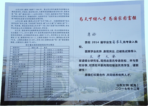 12月12日下午,我校收到了来自山东大学(威海校区)的喜报:2014届1班(班主任:刘长义)孙学友同学考入山东大学后,学习勤奋,表现突出,取得优异成绩,经学校推荐,免试入读天津大学硕士研究生。山东大学特向圣都中学发来喜报。