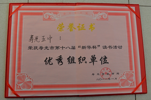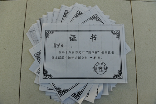 1月10日,寿光市第十八届 “新华杯”假期读书征文活动评选结束,我校17名同学获奖,并被评为“优秀组织单位”。贾梦召 、张静怡 、刘瑞卿三名同学获得一等奖,刘彦琨 、柴赛、 李嘉轩 、刘旭四名同学获得二等奖,王静之 、纪玲等十名同学获得三等奖。