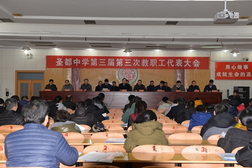 董校长说,三届教职工代表经过民主选举产生并依法行使代表权以来,在上级教育主管部门的正确领导下,圣都中学恪守“责任为天”的学校精神,坚持党建统领全局,扎实转变作风,狠抓教学质量提高,圆满完成了三届一次、二次大会提出的任务目标,成功实现了教育教学质量的连年攀升,校园环境明显优化、师生生活质量明显提高,在争创教育现代化品牌的道路上取得了巨大成就。董校长实事求是的分析了目前工作中存在的问题和不足,提出了新一年的奋斗目标和任务:进一步强化党建统领,坚持务本求进的品牌化持续发展战略,打造责任心和教学水平双一流的育人团队,以高效课堂促育人效益的大面积丰收。