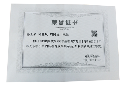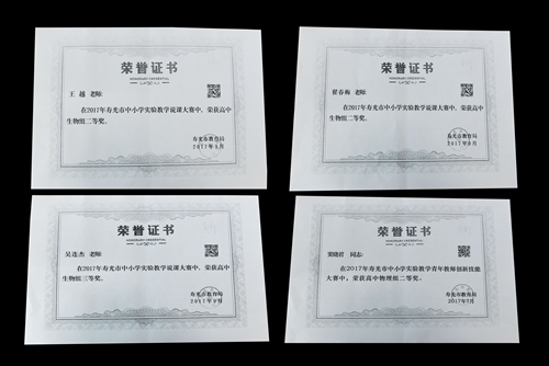 3月3日,教学处收到了市教育局颁发的多本荣誉证书:2017年寿光市中小学实验教学青年教师创新技术大赛,窦晓君老师荣获物理组二等奖;2017年寿光市中小学实验教学说课大赛,翟春梅、王越及吴连杰老师分别荣获生物组二、三等奖;2017年寿光市中小学创新教育成果展示会,孙玉果 、邱桂凤 、周阿妮老师的创新成果《陪学生放飞梦想三十年》荣获创新项目二等奖。