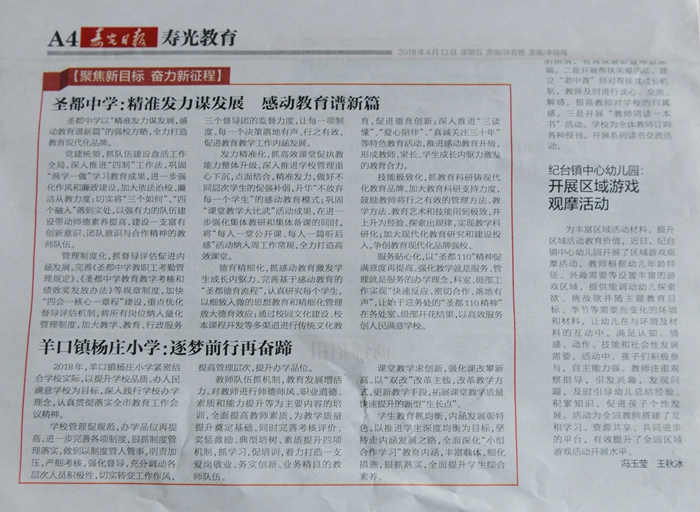 4月13日,寿光日报A4版“寿光教育”栏目发表了我校落实全市教育工作会议精神征文稿件:《精准发力谋发展,感动教育谱新篇”》,从党建统领、管理制度化、发力精准化、德育精细化、技能细致化、服务贴心化六大方面推介了我校全力打造教育现代化品牌的强校方略。