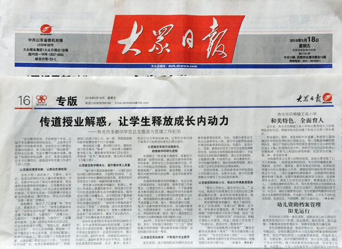 5月18日,大众日报在16版头条以《传道授业解惑,让学生释放成长内动力》为题,报道了新学年开始以来,圣都中学党总支不断强化党建统领意识,努力推进基于“感动教育”的特色化发展,将党建落实到教育教学工作的每一个细节,用不断提高的育人质量,推进学校教学质量的事迹。