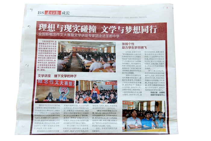 5月31日,寿光日报以《理想与现实碰撞 ,文学与梦想同行---全国新概念作文大赛暨文学讲座专家团走进圣都中学》为题在B8版刊登了全国新概念作文大赛暨文学讲座专家团莅临我校传经送宝盛况,并推介了我校作文教学所取得的成果。