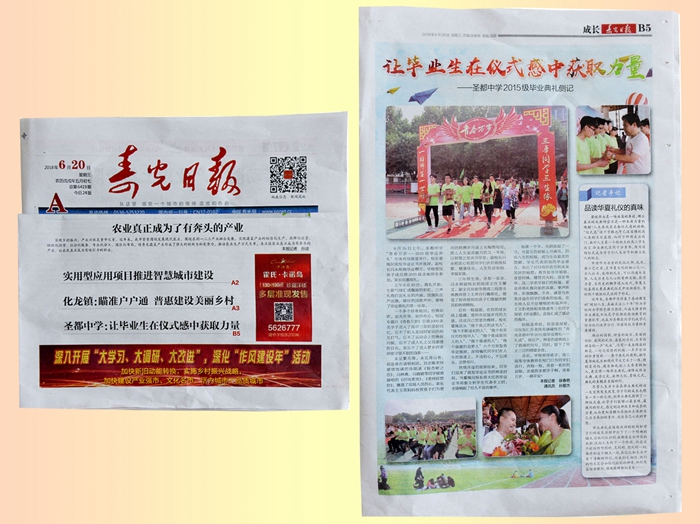 6月20日,寿光日报以《让毕业生在仪式感中获取力量-----圣都中学2015级毕业典礼侧记》为题在B5版整版刊登了我校2015级学生毕业典礼盛况并加了记者手记,对我校毕业典礼给予了高度评价:圣都中学毕业典礼,融华夏传统礼乐和现代节庆艺术于一体,特别是司仪、鼓乐和礼炮三大要素的加入,更是将一场毕业典礼,演绎成修业之典、成学之礼、出师之仪、晋级之式,典礼的骨髓在圣园回归。