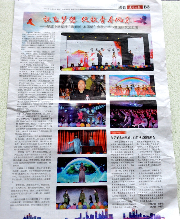 109日,寿光日报以《放飞梦想 绽放青春风采----圣都中学举行“青春梦家国情” 金秋艺术节暨国庆文艺汇演》为题在B3版整版报道了我校金秋艺术节暨国庆文艺汇演盛况,向读者推介我校利用艺术节活动的契机,充分挖掘师生的艺术创造力和表演力,形成了“面向所有学生,促进每一个学生学业水平和人格素养都得到适合自己的最好发展”的特色办学之路。